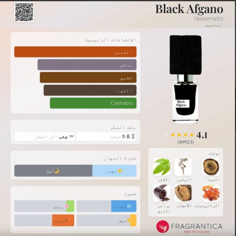 عطر بلک افغان یا بلک افغانو Black Afgano عطری کلاسیک است که شاهکار برند معروف ناسوماتو است. این عطر در سال 2016 به بازارهای جهانی عطر عرضه شد. این محصول با رایحهای گرم و تند و با گروه بویایی چوبی، عطری مردانه است. که مورد توجه زنان هم قرار گرفته است. این عطر هوس انگیز و جذاب بدون اغراق با روح و روان خاص پسندان بازی می کند.